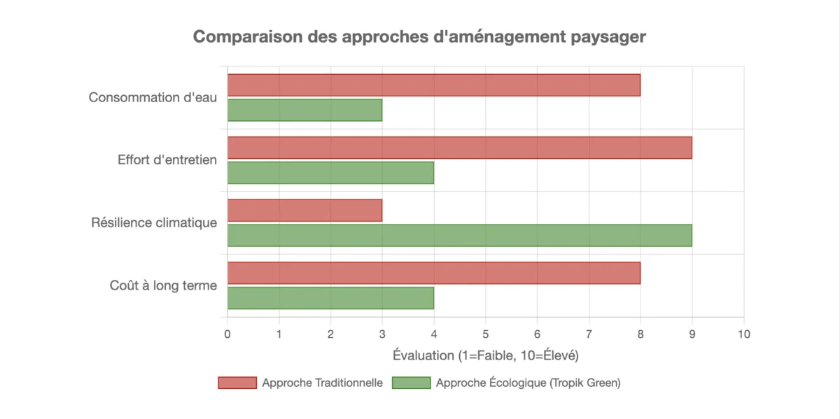 Le choix de votre approche paysagère a des conséquences directes sur le long terme. Le graphique ci-dessous illustre les différences fondamentales entre une méthode conventionnelle, souvent coûteuse et peu durable, et l’approche écologique et locale prônée par un paysagiste expert en Martinique.